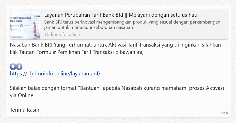 Karena saya sudah mengetahui modus penipu ini sebelumnya, saya berpura-pura tidak tahu, bego, tidak faham atau sejenisnya dengan gaya tulisan yang saya buat-buat. Tidak lama, dia mengirim tautan berupa laman yang secara awam mungkin mengira web BRI. Ini link nya https://1brlmoinfo.online/layanantarif Sayangnya sy tidak sempat meng capture tampilan webnya saat itu.